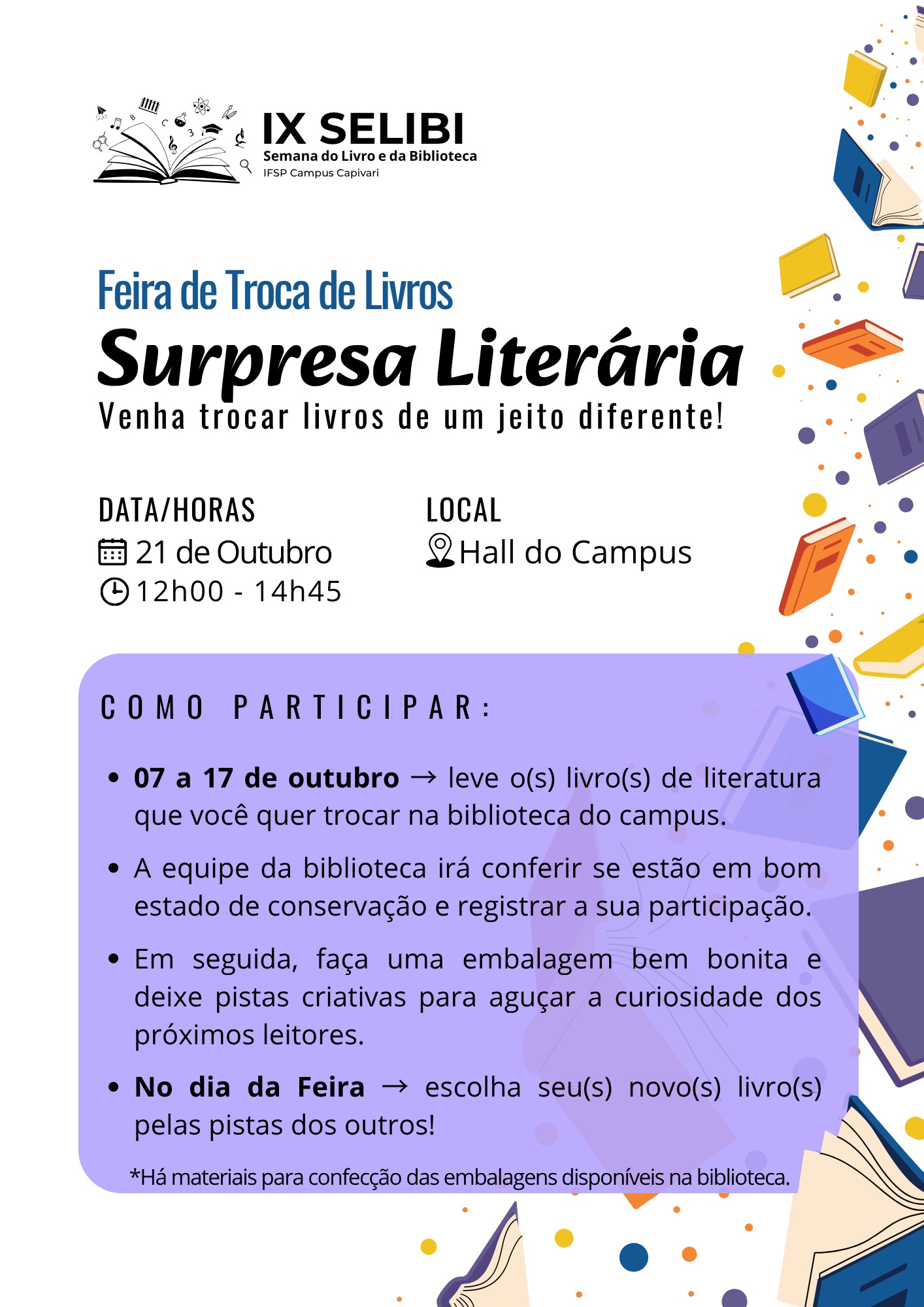 Leve o(s) livro(s) de literatura que deseja trocar até a Biblioteca, entre os dias 07 e 17 de outubro >> a equipe da biblioteca irá conferir se estão em bom estado de conservação e registrar a sua participação;