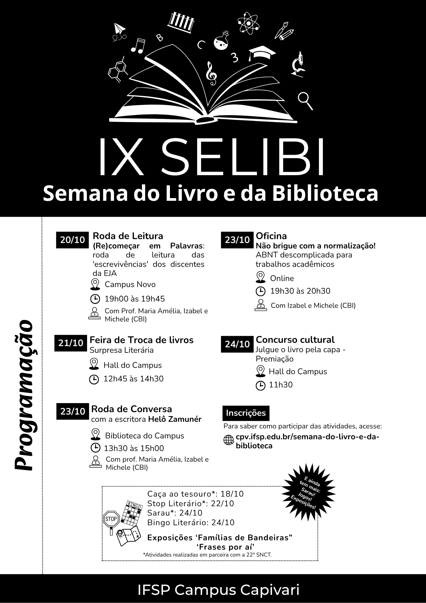 Mais informações e links de inscrição para as atividades na Página da SELIBI.