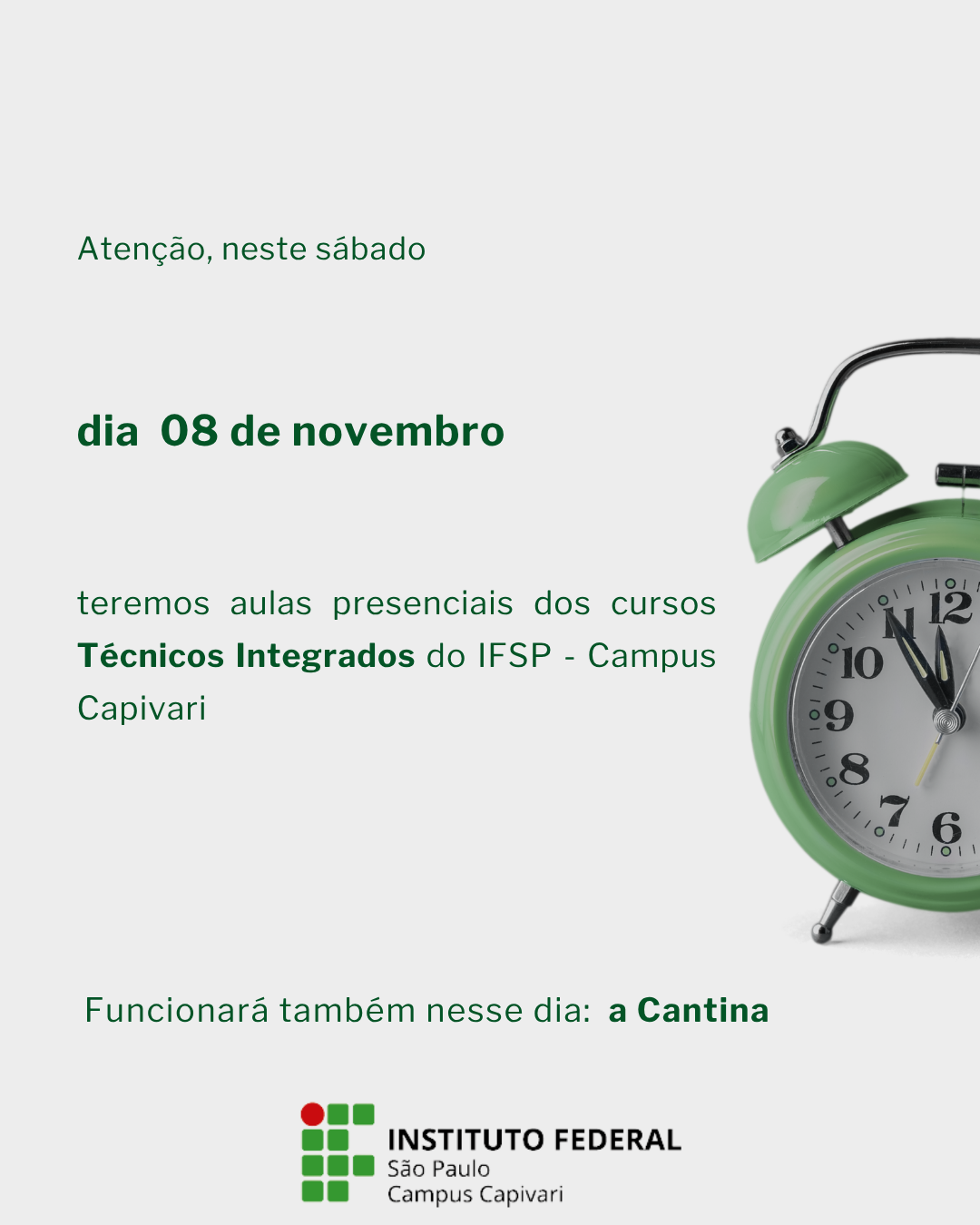 O Instituto Federal de São Paulo (IFSP) – Campus Capivari informa que no próximo sábado, 08 de novembro, haverá aulas presenciais para os Cursos Técnicos Integrados.