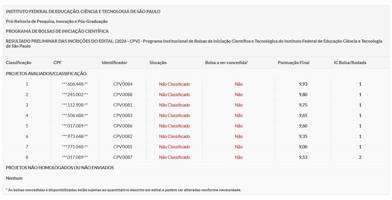 CPI - Resultado Parcial do Processo de Seleção de Projetos para a Edição 2026 do Programa PIBIFSP