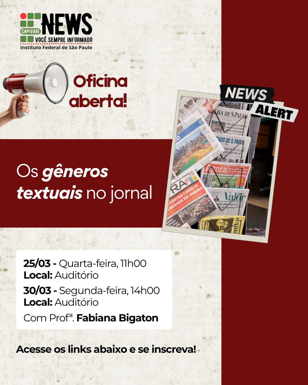 A próxima oficina será ministrada, presencialmente, no auditório do campus, pela professora de Língua Portuguesa, Fabiana Bigaton. O objetivo é apresentar alguns dos principais gêneros textuais presentes nos jornais (em suporte físico e virtual): notícia, reportagem, editorial e artigo de opinião. Por meio da leitura de textos retirados de diversos jornais em circulação, pretende-se analisar estrutura, conteúdo e finalidade desses textos da esfera jornalística.