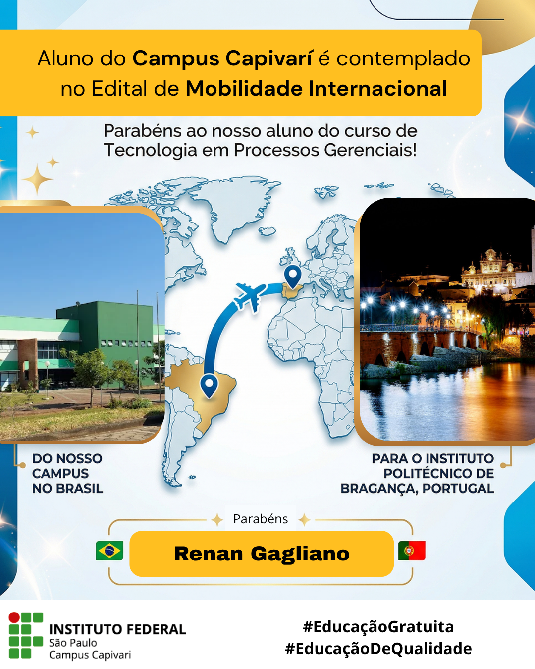 O Campus Capivari celebra mais um marco importante em sua trajetória acadêmica com a confirmação da ida do estudante Renan Gagliano, do curso de Tecnologia em Processos Gerenciais, para o Instituto Politécnico de Bragança (IPB), em Portugal. Renan foi selecionado por meio do edital de mobilidade internacional do IFSP, reforçando o compromisso da instituição em conectar seus alunos com centros de excelência global.