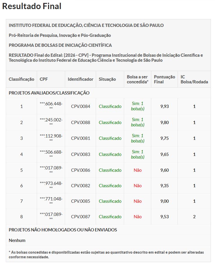CPI - Resultado Final do Processo de Seleção de Projetos para a Edição 2026 do Programa PIBIFSP